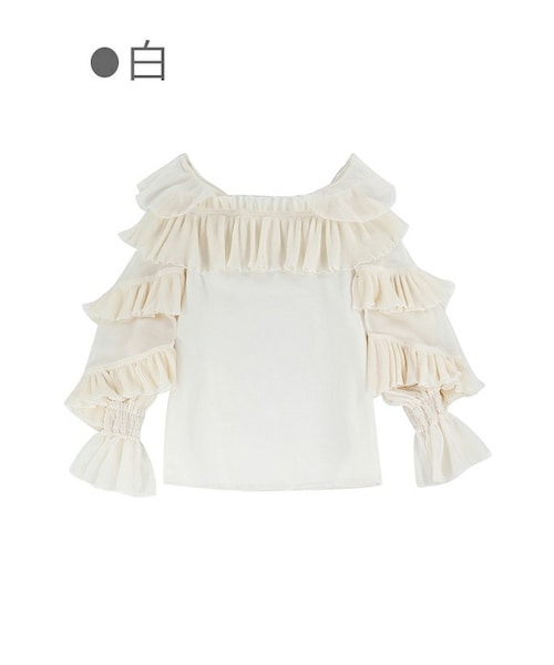 春夏らしい肩出しStyleのチュニック 肩ライン+計算された躍動感 レイヤードフリル袖がさらに引き立つ 主張性あるボリューミーなスリーブには あえてスッキリめパンツを合わせて メリハリ感を出すSETUPがおすすめ 「白」と「コーラルピンク」の2色展開