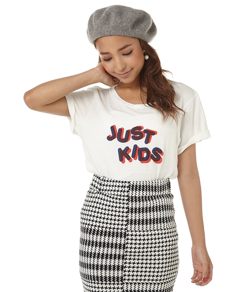 シンプルながらも目を引く“JUST KIDS”のロゴをフロントにあしらったTシャツ。華奢感を演出するルーズなサイジングで、カジュアルながらも女らしいニュアンスで着こなせる一枚に仕上がっています。ウエストインでもアウトでも着られる標準的な着丈もスタイリングしやすいポイントに。袖はロールアップして、こなれた感を演出してもGOOD。一枚着はもちろん、シャツを羽織ったりと、重ね着スタイルにも重宝します。