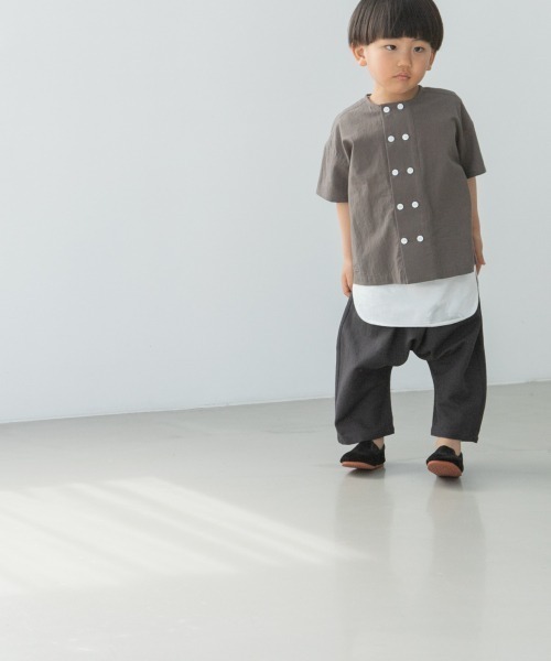 9分丈のサルエルシルエットのパンツ。 ゆったりとしたシルエットで暑い時期にもはきやすいパンツです。 ウエストはゴム+紐になっています。 Tシャツ合わせでシンプルに着ても良し。 女の子は少しガーリーなブラウスなどと合わせて着ても可愛いです!