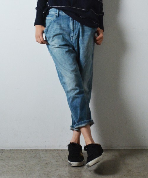 ワークテイストの8分丈ジーンズです。ポケットの配置バランスや少し薄めのブリーチ加工など、夏らしさを感じるジーンズです。腰回りに少し丸みを持たせ、ひざから裾にかけてきゅっと絞り込んだ程よいサルエルシルエット。腰穿きしてロールアップして軽く着こなして頂きたいアイテムです。 店舗にて在庫をお探しの際は、下記の品番をお申しつけください。 品番:AP217 model:H165 B78 W56 H85 着用サイズ:X-SMALL recommend_w