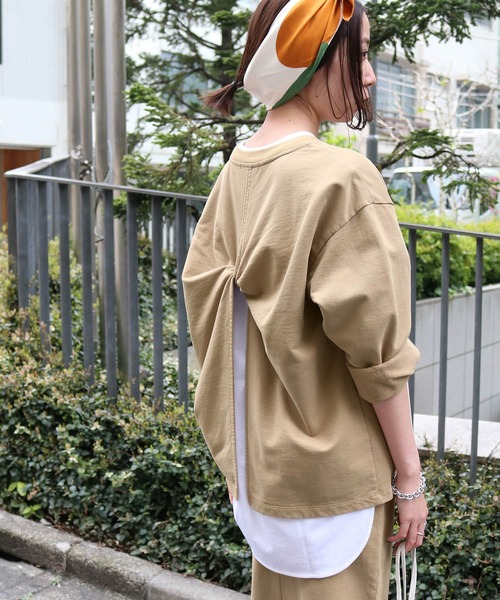 イージーな着心地のセットアップとしても、1枚でも着られるデザイントップスバックにツイストディティールが入ったデザイントップス。中にチュニックロングTシャツをレイヤードして着ると更に今っぽい着こしに。絶妙な着丈が着こなしの幅を広げてくれる。パンツ合わせもセットアップのスカートとの合わせも〇。デザイン性が高いのでカジュアルな着心地ながら、単品でも着こなしが決まるトップスです。袖口はラフな筒袖が気分。そのままでラフに着てるのも、くるっと折り返して着るのもおすすめ。素材は、裏毛にバイオ加工とシリコン柔軟をし、ナチュラルなフェード感をプラス。質感が分かるような中濃色の2色展開。ドライタッチかつ生地にコシがあるので、一般的な裏毛とは違った手触りが特長です。同素材の裏毛バイオスカート(品番:GAC00070)と合わせると、カジュアルなセットアップスタイルが楽しめます。