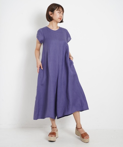 【デザイン】・スカート見えするワイドシルエットのオールインワンです。・Vネックが顔周りをすっきり見せてくれ、胸下のさりげないタックが全体を引き締めてくれます。・ロング丈でもパンツになっているので、歩きやすいです。【スタイリング提案】・スニーカーとも相性抜群ですが、ローヒールパンプスを合わせて足元を大人っぽくまとめるのもおすすめです。【特徴】・透け感:なし・裏地:あり・光沢:なし・生地の厚さ:普通・伸縮性:なし・シルエット:スタンダード【取り扱い注意事項】素材の特性上、他の衣類との摩擦や汗・雨に濡れた場合、色にじみ・移染の恐れが有ります。濡れた場合は素早く拭き取り乾かして下さい。素材の特性上、洗うと多少縮みます,予めご了承いただき、ご使用の際にはご注意くださいますようお願い致します。※画像の商品は光の照射や角度により、実物と色味が異なる場合がございます。また表示のサイズ感と実物は若干異なる場合もございますので、予めご了承ください。