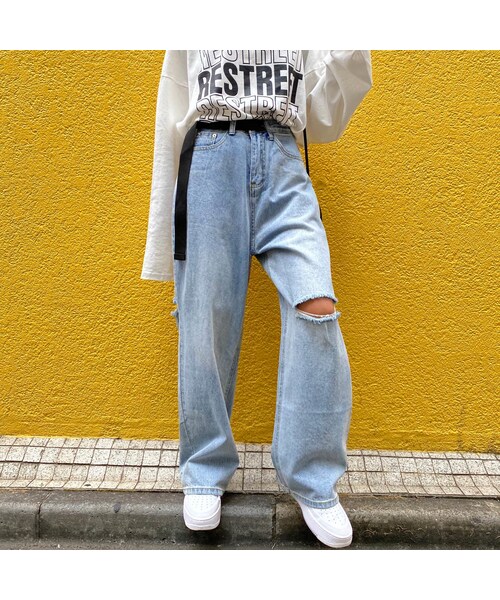 ※ご利用頂く全てのお客様は必ずABOUTをご覧下さい。ご購入される全てのお客様はABOUTに同意していただいたものとさせて頂きます。 ブルーSサイズ着用/ブラックMサイズ着用 脚長効果抜群❤️ ずり落ちてこないよう調節可能なベルトが付いてるので落ちてくる心配がない❤ ハイウエストで履くデザインなのでウエストが細めになっています! 膝と膝裏にダメージが入ってます。 «素材» コットン «カラー» ブラック/ブルー «サイズ» Sサイズ ウエスト→60cm 股上→35cm 股下→67cm 太もも周り→64cm ヒップ→94cm 総丈(側面)→103cm Mサイズ ウエスト→66cm 股上→36cm 股下→ブルー67cm/ブラック70cm 太もも周り→66cm ヒップ→100cm 総丈(側面)→105cm モデル→158cm