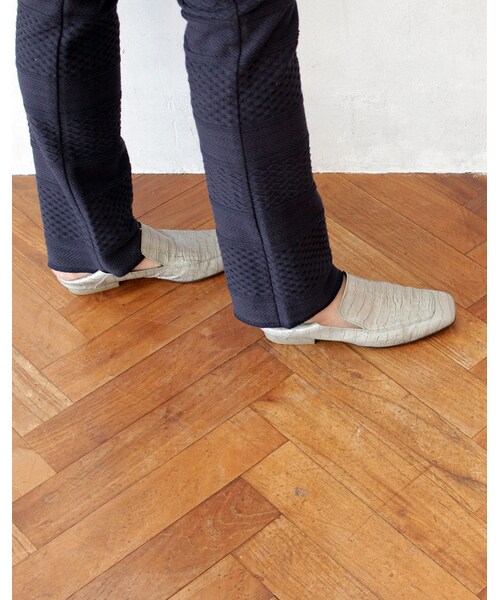 『Pelleterno(ペレテルノ)』のニューコレクションがスタート。先シーズン、即完売でリクエストもかなりいただいていた、ローファーバブーシュ。なんと!特別に別注で作ってもらいました!ここ数年、かかとをふんで履くこともできるバブーシュタイプに大注目!足元にちょっとラフな抜け感が漂うような気がして、スタイリングをあえて着崩したいときにスニーカーでもよくやる履きこなしです。ただレザーのシューズとなると、キチンとした靴作り・素材選びがないと履きにくいし、耐久性も落ちるので、やっぱりそうなると『ペレテルノ』になる訳です。目の細かなキッドレザー(山羊革)ベースのパテントに、ミントグリーンのステッチをきかせました。パテント・クロコ・バブーシュ。私的には、好きなポイントがギュッとつまったシューズで、即決しました!重要なかかとには、特殊なのりを使用し、かかととしての強度を持ちながら柔らかく作られているので、かかとを踏んでバブーシュみたいに履いてもはき心地は変わりません。プラス、幅広めのスクエアトゥで足指が楽チンな木型を使用。足先が長めのこの木型は、フラットシューズでも足が華奢でキレイに見せてくれます。 〈マイノリティファン〉