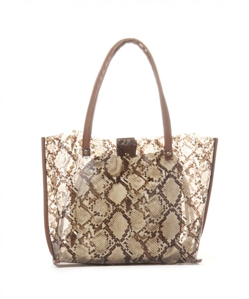 トレンドのPVC素材を使用した、アニマル柄のトートバッグ。柄をほどこすことで、透け感に抵抗がある方もトライしやすいデザインに。付属の巾着と一緒にお使いいただけば、中身を隠すこともOK◎