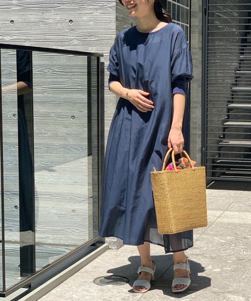 シンプルなデザインながら上質な素材感。シアー感が今っぽいワンランク上のカジュアルスタイルコットンシルクのローン素材を使用したワンピース。程よい光沢ときれいな発色が、カジュアルなデザインながら上品なスタイリングに仕上げてくれます。袖口と衿ぐりがフライスになっているカジュアルワンピース。後ろの釦明きがポイント。ふんわり風に揺れるAラインシルエットは、これからの季節1枚でさらりと着るのが気分です。パンツやリブパンツとのレイヤードスタイルもおすすめ。シアー感がいまの気分。1枚でラフに着られてスタイリングが決まる、万能ワンピースです。