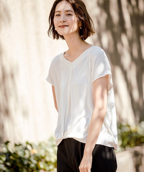 ジャケットのインでも着やすいフハクとカットのドッキングトップス。フロントの裾をドレープデザインにしたので、パンツのデザイン関係なくインをしなくてもきれいなシルエットを演出してくれます。フロントはフハクなのできちんと感がありますが、バックはストレッチの効いたカットソーなので動きやすさ抜群◎汗をかきやすいこれからの季節に嬉しい「抗菌防臭」の機能付きでお仕事着としても頼もしい1枚です。