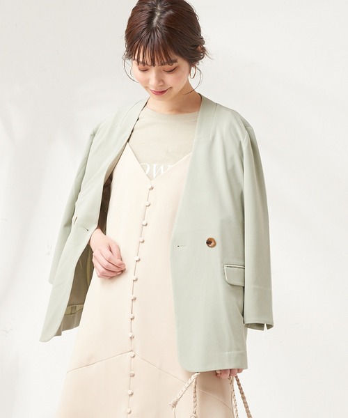【2020SS natural couture】羽織るだけでトレンド顔♪セットアップでも楽しめるノーカラージャケット今年大注目のジャケットがナチュらしいカラーで登場!かっちりとしたディテールに少し長さを出した丈感でこなれ感のある形に仕立てました。程良くゆとりのあるサイズ感なので中には様々なアイテムを合わせていただけます。かちっとしたスタイルが苦手な方でもデニムやラフなTシャツと合わせて気取らないリラックス感のある着こなしもお楽しみいただけます。同素材の【311510220 編み込みベルト付きパンツ】と合わせてセットアップでもお召しいただけます。気軽にトレンドスタイルの叶うノーカラージャケットをぜひお試しください♪