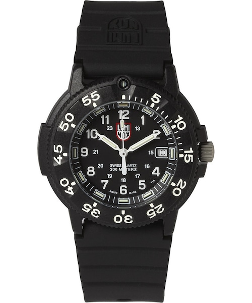 Originally designed for US Navy Seals, Luminox ' carbon-reinforced watch is water resistant up to 200 metres and has an illuminating mechanism for visibility in the dark. With a rubber strap and contrasting white lettering, this reliable design is a solid piece of performance wear. Black 3000 series watch Carbon-reinforced PC case, white lettering, hardened mineral cover Rigged-rubber strap, buckle fastening Glow in the dark mechanism Swiss made quartz movement Water resistance 20ATM Comes in a branded box