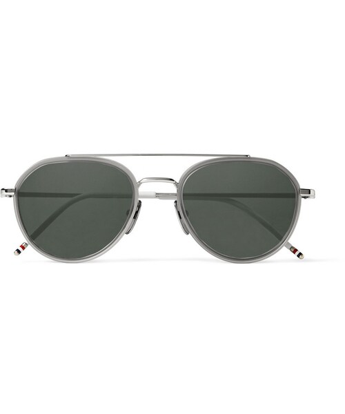 Crafted from lightweight silver metal and fit with chrome-effect mirrored lenses, Thom Browne 's rounded aviator-frame sunglasses are sleek and cool. Smart finishing touches like semi-translucent grey trims, rubberized temple tips and an anti-reflective coating ensure a comfortable, practical fit. Silver metal rounded aviator-frame sunglasses Metal browbar, semi-translucent grey acetate trims, silver mirrored lenses with anti-reflective coating, signature red, white and blue rubberized temple tips Made in Japan Comes with a hard case and cleaning cloth