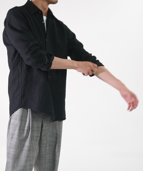 フランダース地方のLINEN原料を使用した、リラックスシルエットのドレープリネンシャツ。【素材】 フランダース地方のLINEN原料を使用した、ナチュラルな糸形状を保つ太番手LINENを使用しております。 ハリとコシ、高い強度に加え、ふっくらとした弾力性に優れ、繊維の光沢感を見せています。 洗うごとに糸の中の繊維が細かく分離することで柔らかさが増していきます。 カラーも、ナチュラルカラー亜麻と晒との交織でLINENらしさのある優しい生地に仕上がっています。 【デザイン】 セミワイドカラーの長袖シャツです。ややゆったり目のシルエットで且つ、 とろみがあってハリコシのある素材感のため、春夏秋とロングスパンで使用できます。 着用したときに上品に生地の揺れる感じが楽しめリラックス感も。 カジュアルではデニムと合わせてラフに着こなすのがおすすめ。