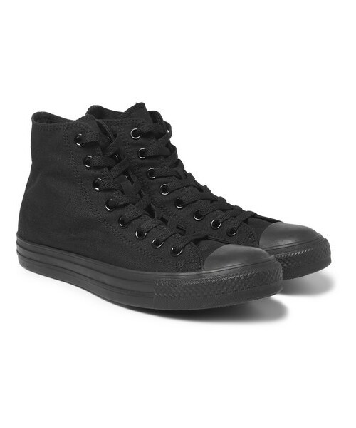 In 1917 Mr Marquis Mills Converse developed a rubber-soled shoe and named it after the basketball player Mr Chuck Taylor, and the iconic style is still going strong. Crafted from black canvas with the classic logo tab, this black-on-black pair embodies the design's covetable, cool simplicity. Teamed with your worn-in blue denim this timeless pair will see you through whatever your weekend has in store. Shown here with an A.P.C. T-shirt and jacket , Nudie Jeans jeans , Folk bracelet , Miansai bracelet and Uniform Wares watch . Black canvas high top sneakers Rubber soles, rubber toe cap, heel and side logo Lace-up Come in a box