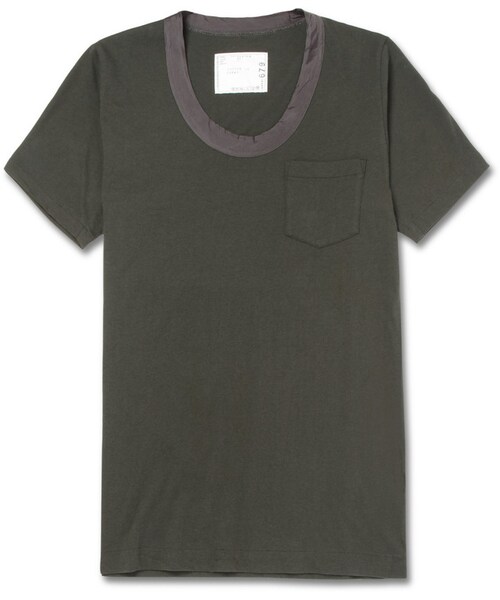 Japanese label Sacai often makes use of contrasting fabrics to achieve its unique vision, and this cotton-jersey T-shirt has a satin collar to give the otherwise classic piece a sense of flair. The deep grey-green tone keeps the look grounded, making this style surprisingly easy to wear. Try it with a navy or black outfit to make the most of the detailing. Shown here with an Alexander Wang jacket , Ann Demeulemeester trousers , Maison Martin Margiela bracelet and Alexander McQueen shoes . Grey-green cotton-jersey T-shirt Grey satin round collar, chest pocket 100% cotton; trim: 100% cupro Machine wash or dry clean Made in Japan