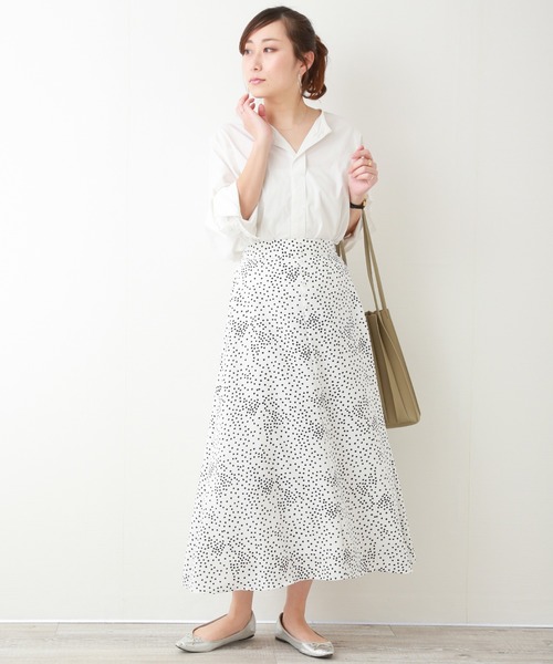 ドットを不規則に散りばめチャーミングな仕上がりに。シーンを選ばない使用はきれいめな印象です。ウエスト部分のシェル風ボタンがシンプルなデザインの中で上品さを演出。バックウエストはゴムで楽な履き心地です。綺麗なAラインのプリーツが歩くたびに雰囲気のある上品な揺れを表現するスカートです。※裏地があるので透け感はなく、安心して着用できます。※屋外の光や照明の当たり具合、パソコンなどの閲覧環境によって実際の色味と異なって見える場合がございます。予めご了承ください。
