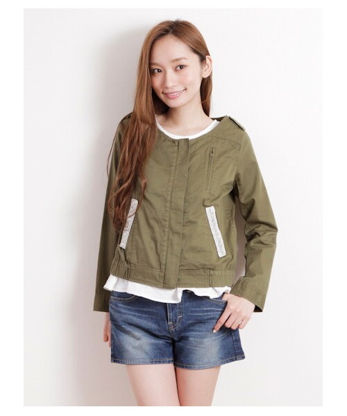 ビジュー付きミリタリーブルゾンです。ミリタリーブルゾンを丈を短くノーカラーで襟ぐりを広めに仕上げました。ポケットの装飾を取り外しのきくビジューでデザインしているので、女らしさもきちんと忘れないアイテムです。秋口のスタイリングにさらっと羽織れば完成です。【モデル身長:約169cm/着用サイズ:Fサイズ】