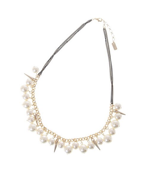 パールのショートネックレスです。大小混ざった上品なパールにハードな印象のズタッズパーツを合わせたところがポイントです。普段使いにも使えるビジューネックレスはスタイリングに欠かせないオススメのアイテムです。
