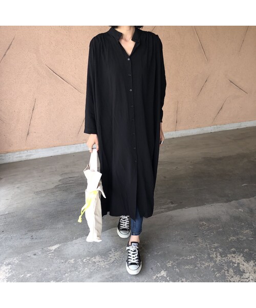 大人の女性の魅力を惹き出すノーカラーロングシャツワンピース。 背中と肩の切替えにあしらったたっぷりのギャザーが作り出すふっくらとしたシルエットが優美な印象を与えてくれる1枚♪ COPINE人気カラー、ブラックとカーキをご用意致しました。 ワンピースとしてだけでなく、フロントを開けて羽織りとしてもお楽しみ頂ける人気アイテムです! ※モデル身長:161㎝ ◆クリックポストにて代引きをお選び頂いた方は、390円プラスさせていただき、宅配便代引きにて発送させていただきますのでご了承下さい。 ◆カラー カーキ・ブラック ◆サイズ 着丈 119cm 身幅 71cm 裾幅 91cm 肩幅 44cm 袖丈 48cm 袖口幅 12cm ※多少の誤差は予めご了承ください。 ◆素材 レーヨン100% ※こちらの商品は海外縫製の為、多少歪み・縫製の甘さ(糸の出)などがある場合がございます。予めご了承下さい。