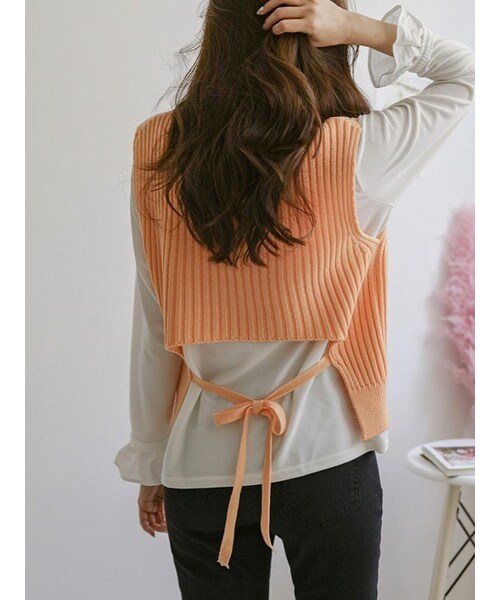マンネリ気味のコーディネートをバージョンアップしてくれるニットベスト★ バックスタイルに施したリボンが着こなしのアクセントになってくれます。 顔周りをすっきり見せるVネックが、大人っぽさを後押しする1枚です。