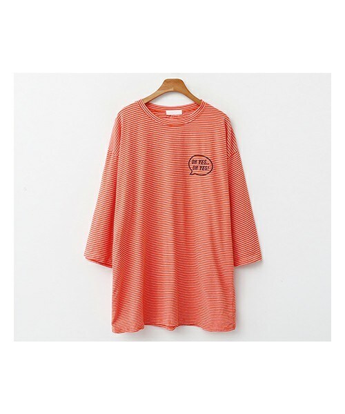 全体にボーダー柄が軽快な着こなしをメイクするリラックスムードのコットンTシャツ☆ バックにインパクト効果抜群のビッグロゴで可愛いバックスタイルを作り出してくれるのがポイントです。 ゆったりとオーバーサイジングにヒップまで庇ってくれる丈感なので、体型カバーもすっかり◎ お家アイテムとしてはもちろん、ちょっとしたお出かけにも最適な可愛い1枚です♪