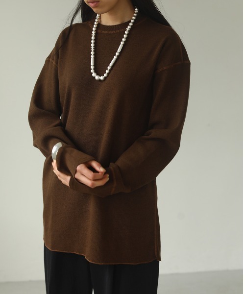 国内でオリジナルで編み立てたコットンリブの生地を使用したプルオーバー。太い糸を甘撚にすることで、しっかり度詰めで編んでも柔らかい着心地と風合いです。脇線とアームホールはフラットシーマステッチ(4本針縫製で縫いしろがフラットになる)の本格的な仕様。 マニッシュなオーバーサイズで、ラフに着て頂けます。