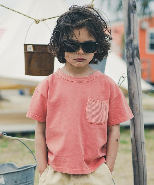 ビッグシルエットが特徴的な半袖Tシャツは、ピグメント加工を施し、風合い・あたり感がありビンテージライクな仕上がりに!ポケット部分はニット素材を使用することで表面感をプラスしました。後ろには別生地でロゴをたたきつけリメイク風に♪ ※90cmは、首元がスナップボタン仕様となります。