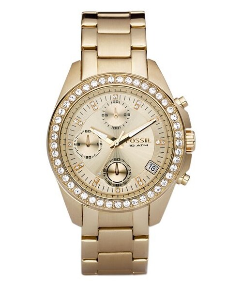 Swarovski crystals illuminate the chronograph dial and topring of a stylish gold-plated watch finished with a classic bracelet band. 38mm case; 18mm band width; 175mm band length. Stainless steel/gold plating/Swarovski crystals. By Fossil; imported. Fossil Watch Instruction Manual PDF