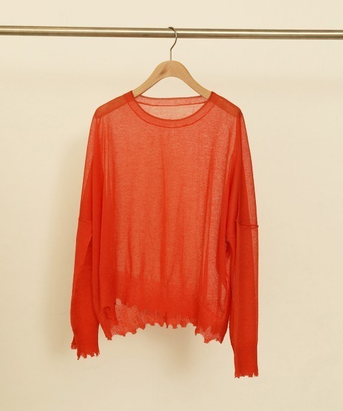 薄いシアー感のあるニット。ドルマンスリーブでゆるっとしたシルエットで、ダメージ加工を施しているのでカジュアルに着られる1枚。