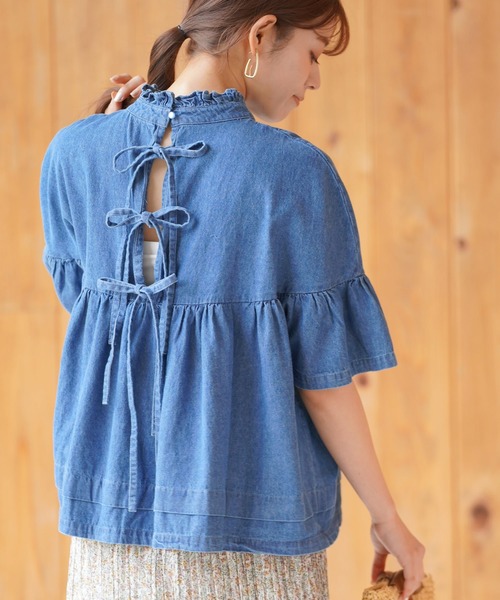 大人かわいいデニムのフリルブラウス カジュアルデニムをフリルとギャザーで甘めに仕上げたブラウス。 存在感のある大人かわいい装いが楽しめるアイテムです。 襟元は立ち上がりのあるフリルで上品に。 胸元と袖のギャザーでふっくら愛らしいシルエットを描きます。 背中には3つのリボンを縦に並べてバックスタイルもフェミニンに。 裾は広がりすぎないようタックで重みをつけました。 注目度高めのデニムブラウスです♪ 裏地なし 伸縮性なし 薄手 バックリボン取り外し不可(ほどくことはできます) 首後ろボタンあり デニム素材ですので色落ち等ございます (しばらくは単独でお洗濯してください・白系のお洋服や小物類等一緒にご着用されますと色移りする場合がございます) 洗濯:洗濯機使用可
