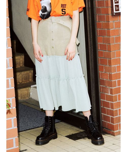 ※ボタンの間隔は均等になります。※モデル着用画像は光の当たり方の加減で異なる色味に見える場合がございます。実際の色味は生地のズームアップ画像をご確認ください。表面変化のある生地と透けるシフォンをドッキングしたスカート。中に履くショートパンツ付きで安心して着用いただけます。透け感のあるティアードスカートが軽やかな印象にしてくれます。ブーツと合わせ、甘辛スタイリングにするのもおすすめです◎