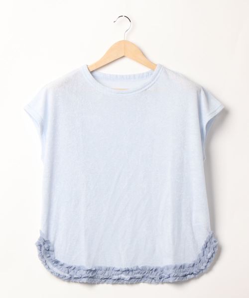 夏の人気素材柔らかパイル生地シリーズ。無地シリーズは透け感のある別布フリルがデザインポイント。半袖トップスはフレンチスリーブデザイン。サイドに向かって短い裾口全体に2段のフリルを施しました。