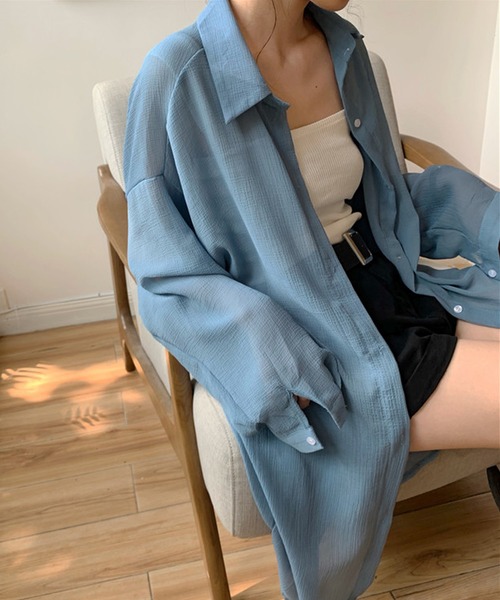 上品な透け感がポイントの今シーズン注目のシースルーシャツ 今季注目のシースルーシャツは、透け感が軽やかにみせてくれるので、ベーシックカラーはもちろんですが トップスボトムをカラー同士で組み合わせてもお洒落な着回し抜群アイテム! 長めの丈でお尻が隠れるのもうれしいポイント。閉じて着ても、開けてきてもおしゃれに決まるコーディネートしやすい万能な一着です。 夏の日よけとしても便利。