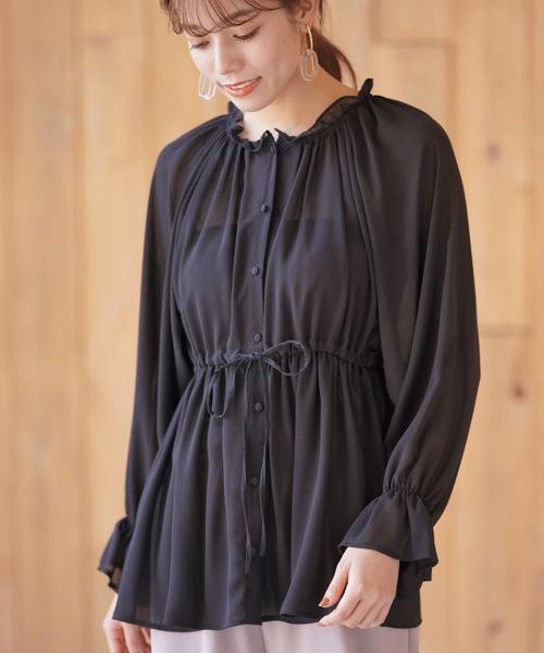 トレンドスタイルに欠かせないシアーブラウス 今季注目度高めのシアー素材のブラウス。 透け感だけでなく清涼感も与えてくれる楊柳シフォンを使用しました。 フリルの襟が顔周りをフェミニンに。 キャンディスリーブで手元に女性らしい華やかさを作りました。 ウエストリボンをきゅっと絞ればドロストスタイルにも。 リボンを絞らずふんわり着たり、前を開けてさっと羽織ったり、コーデが楽しくなるアイテムです。 裏地なし 伸縮性なし 薄手 前開きボタン留め ウエストリボン調節可 袖口ゴム仕様 洗濯:手洗い可