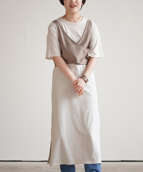 コーデが決まる♪ベスト付きワンピ おしゃれな重ね着がだれでも楽しめるベスト付きワンピース。 難しいレイヤードも楽々作れるセットアイテムです。 インナーはすとんとした大人シルエットなカットワンピース。 メロウ仕上げの袖口がカジュアルながら女性らしさも忘れません。 両サイドにスリットが入っているので足さばきもよく足元にこなれ感をプラス。 印象的なバックスタイルを演出するレースアップのベストはフロントもカシュクールの女性らしいデザインです。 それぞれ単体でも使えるので着回しの幅も広がります♪ 裏地なし ワンピのみ伸縮性あり 薄手 織キズやだま等みられる場合もございます 洗濯 インナー: 洗濯機使用可(ネット使用) アウター:手洗い可