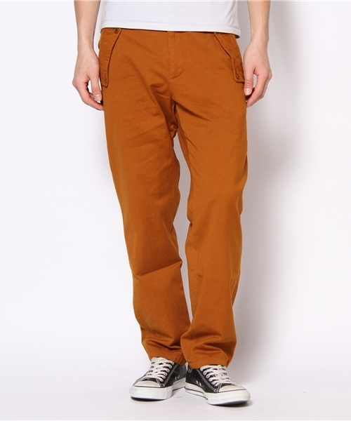 KATHARINE E HAMNETTライン。 KATHARINE HAMNETT LONDONの80年代コレクションアーカイブからリバイバルしたパンツ。 イギリス陸軍のミリタリーウェアをベースにしたテーパードタイプ。 オーガニック・テキスタイル世界基準(GOTS)の認証を受けたオーガニックコットンを 使用しており、付属品にも再生エコファスナーや椰子の実のボタンを用いるなどエコロ ジカルなコレクションです。 model:H180 B94 W72 H92 着用サイズ:LARGE