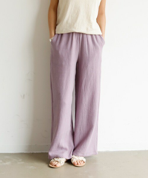 ◆やわらかい肌触り抜群の”ダブルガーゼパンツ” 【特徴】 春夏らしいニュアンスカラーがシーズンムード高まるダブルガーゼパンツ。 ガーゼ素材が肌に優しい、やわらかい生地感なので着心地も抜群◎ 程よい長めの着丈は動きやすく、ウエストゴムでおうちコーデでもラクチン♪ 【スタイリングポイント】 足元はフラットサンダルと合わせて、リゾートスタイルをお楽しみいただけます♪ ダブルガーゼシャツと合わせてセットアップ風スタイルも◎