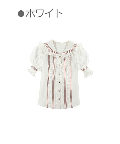レトロガーリーなブラウストップス フリル付いたBIGセーラー襟がとてもCute ピンクのトリプルラインは さりげなくスタイルアップ効果 袖口をキュッと絞って ふっくらとしたパフスリーブの完成 大小異なるフリルレースを全体にあしらい ヴィンテージライクなラブリーコーデに格上げ カラーは「ホワイト」1色のみの展開