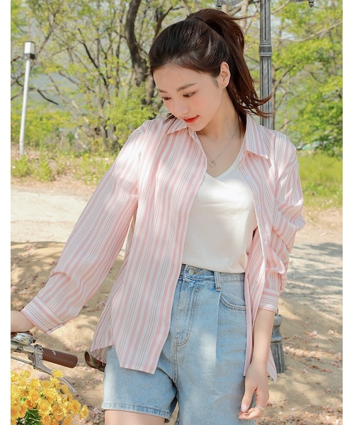 カラーネックで端正な雰囲気を与え、ドロップショルダーライン&余裕のあるシルエットで体型をカバーします。オーバーサイズシルエットで単独での着用はもちろん、レイヤードしたり、アウターとしても着用も可能です。軽くて柔らかい素材でシワになりにくく、管理もラクちん♪前後アンバランスな着丈感でスタイリッシュに演出できます。ストライプパターンでスリム見せはもちろん、コーデのポイントに!ライトピンク、ミントの2カラー展開です。