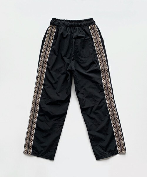 サイドの刺繍がポイントのトラックパンツ ユニセックスのボトムスで、タイトすぎず程よくゆったりとしたシルエットです ウエストはゴムと紐なので疲れず快適な穿き心地◎