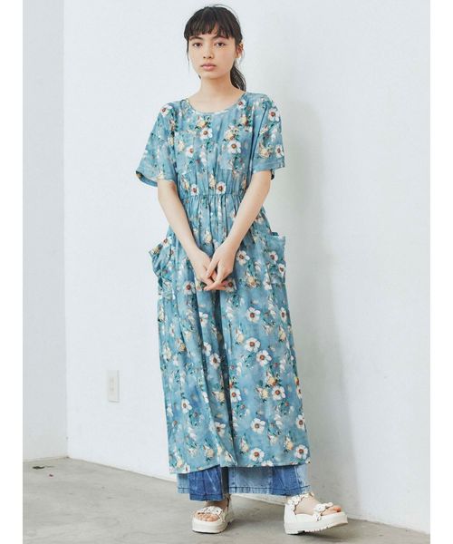 ーLOOK use itemー 水彩画のようなお花柄がアンニュイな雰囲気の、 さらっと着られるロングワンピース。 ネック部分は少し広めに開け、 顔周りをすっきりと見せてくれます。 ポケットに立体感を持たせたり、 配色のステッチを施し、 こっそりとアクセントをプラス。"