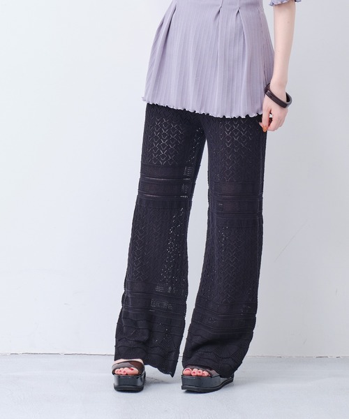 ★新アパレルブランドCONSCIOUS DAY(コンシャスデイ)がデビュー★ 様々な模様の透かし柄がお洒落な印象を与えてくれるニットパンツは、フレアのシルエットでスタイルアップが叶うアイテム。膝上まで裏地がしっかりと付いているので、安心して着用出来ます。チュニックシャツやワンピースと合わせたレイヤードスタイルもオススメです。
