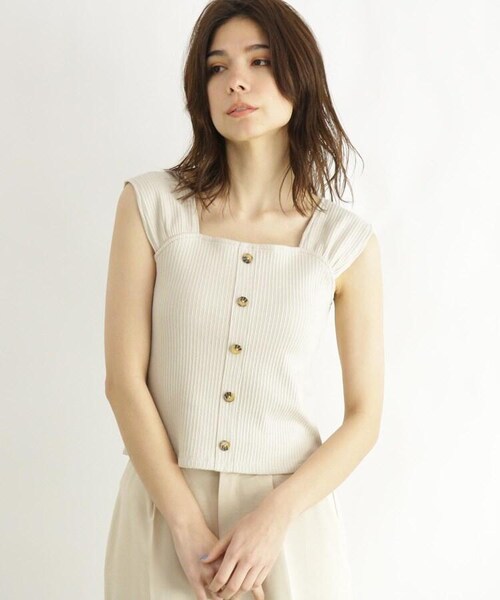 【デザイン】二の腕からアームラインがきれいに見えるノースリーブタイプのプルオーバーです。デコルテの華奢見えも狙えるスクエアネックでおつくりしました。センターのフェイクボタンがポイントです。適度にボディへフィットするのでジャケットやカーディガンのインとしても活躍します。【生地感】適度な肉感のあるリブ素材でおつくりしています。