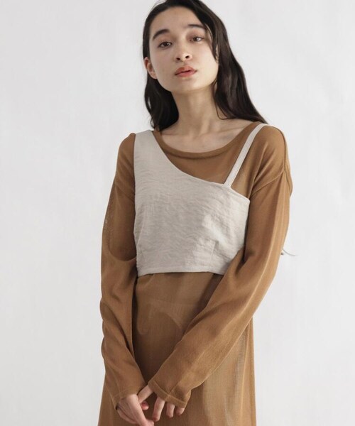 【デザイン】旬のレイヤードスタイルが楽しめるアイテムです。左の肩ストラップのみ細めになったアシンメトリーなデザインや、バックスタイルのシャーリングデザインもポイント。着丈がウエストよりも上の位置なので、スタイルアップも期待できます。【生地感】着やすい柔らかな生地感。 ※着用しているインナーは本商品ではございません。