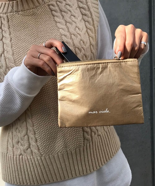 ☆色味と質感が魅力なフラットポーチ☆軽量で耐水性・耐久性に優れたタイベックR生地を使用したフラットポーチです。タイベックにしては珍しい色味の落ち着いたゴールドとシルバーでどんなコーディネートにもマッチします!膨らまないデザインなので小さなバッグに入れてコスメいれや小物いれとして小分けに便利!※タイベックRは米国デュポン社の登録商標です。●タイベックは素材の特性上、若干シワがよっていたりしていることがありますのでご承知の上お買い求めください