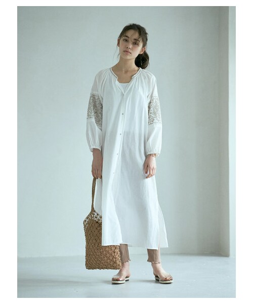 深めのVネックラインが女性らしいワンピース。 繊細な刺繍柄を施し、この1枚で装いに映えるエスニックルックが完成します。ボリューム感のある袖で気になる二の腕周りもさりげなくカバー。 ゆったりとしたシルエットがこなれたスタイリングをアシストします。