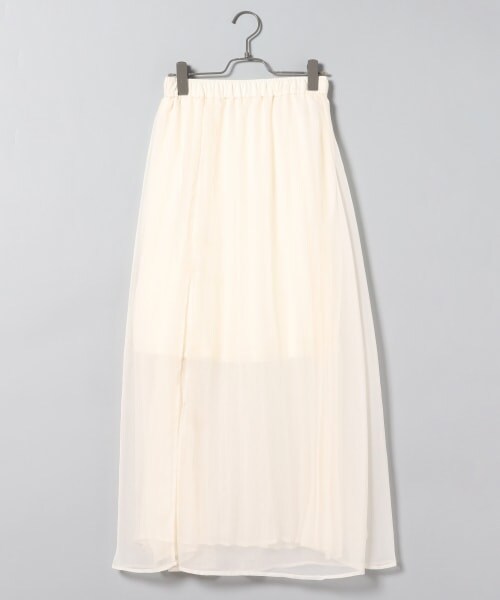 透け感の強い、極薄シフォン生地を2枚重ねたシアースカート★薄手ですが表面がきれいに見える素材感。外側のスカートに入ったスリットから、歩くたびにちらっとプリーツが見えるのがデザインポイント。歩いたときに空気を含んでふわっと動きが出て、ひざ下の透け感もあり女性らしさのあるスカートです!ウエストはゴムで楽な履き心地。身体のラインを拾わずに穿けるのもうれしい♪カットソーやプリントTEEと相性抜群!足元はフラットサンダル・ビガーサンダル・スニーカーがおすすめです!