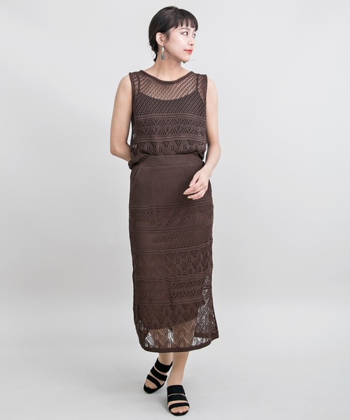 【デザイン】 透かし編みのニットスカートとニットTOPSのセットアップです。スカートにはポリエステルの裏地が付いており、安心して着用できるのもうれしいポイント◎ニットなので足さばきも良くロングでもストレスフリーに着用できます。もちろん上下別々でもお好きなコーデも楽しめます。オフィシャルサイトとZOZO限定のアイテムです。 【MODELサイズ】 ■ブラック | MODEL(メイン画像):身長 165cm / B 81cm / W58cm / H84cm ■ベージュ | MODEL(メイン画像):身長 165cm / B 81cm / W58cm / H84cm ■ブラウン | MODEL(メイン画像):身長 165cm / B 81cm / W58cm / H84cm ■カーキ | MODEL(メイン画像):身長 165cm / B 81cm / W58cm / H84cm <スタッフレビュー> ■スタッフ・I 身長:153 体型:痩せ型 普段の着用サイズ:SS/S ボトムは足首が見えるロングスカートで裏地はふくらはぎ中位の丈です。 ウエストは少し大きめですが気になりませんでした。 トップスはお尻上の丈でノースリーブですが肩幅も少し大きいので 正面から見た時に腕の付け根が見えない位のサイズなのもバランスが良かったです。 セットアップでこの値段もとても嬉しいです。 サンダルとかごバッグに合わせて早くコーディネートしたいです。 ■スタッフ・K 身長:158 体型:普通 普段の着用サイズ:M スカートは足首上ぐらいの長め丈でストレートなシルエットです。裏地もついていて伸縮性もあり着やすいです。セットアップのTOPSはトレンドの透け感があって夏にぴったりなアイテムで中にキャミを着るとかっこよく決まります。スニーカーやサンダルもぴったり♪