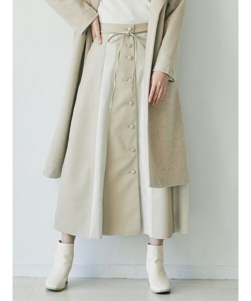 【アイテム】レザーとフェイクスエードのミックスされた珍しさのあるデザイン。フレアスカートにして、存在感を出しました。細身のウエストリボンで尖りが出ない様、スイートな表情に。【スタイリング】ボトムデザインにインパクトがある為、シンプルなリブニットなどを合わせてウエストラインを美しく見せて頂くのがお勧めです。