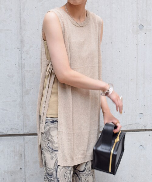 ◆アイテム詳細◆ 表面感のあるニット素材を使用したロングニットベ スト。 大人な抜け感を演出するトレンドのシアーサマーニット。 薄手のサマーニットなので夏も涼しく過ごせます♪ 肩がけして夏用カーデ替わりにしても◎ 両脇にスリットが開いており、レイヤードも楽しんでいただけます。 ボリューム感のあるスカートやタックパンツと合わせて大人なスタイリングがオススメ。 カジュアルが好きな方はもちろんデニムでもマッチします。 ーーーーーーーーーーーーーーーーーー 【セレクト】HAL 【COLOR】アイボリー・ベージュ 【SIZE】Fサイズ 平置き(㎝) 着丈77 肩幅36 身幅51 袖口25 裾幅44(サイドスリットあり) 【素材】本体 アクリル 75% ナイロン 25%