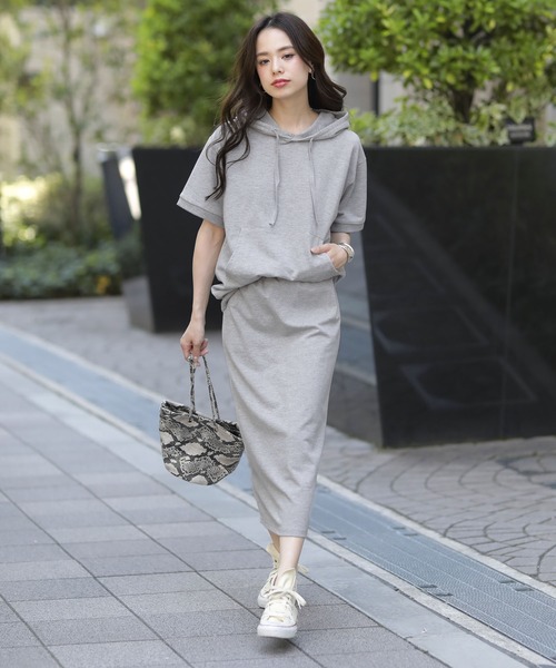 大人のカジュアルスタイルにピッタリ! スウェットセットアップ パーカーとタイトスカートのワンピース見えするセットアップです。 スウェット生地&伸縮性もあるので、着用しやすいです。 ゆるっとしたパーカーが、カジュアルさをプラス、スカートのバックスタイルはスリット入りで軽快な足捌き。 コーデが即決まる優秀ワンピです。さっと着れてこなれた印象に。セットアップでも上下別々でも着まわせる優秀アイテム。 パンプスやスニーカーとの相性◎です。 スタッフおすすめポイント ラフ過ぎない大人のセットアップはデイリーに使えるアイテムでワードローブには必ず揃えたいアイテムです!