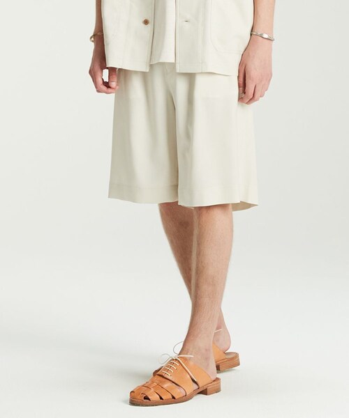「夏のセットアップ」の本命ショーツ。 ダブルステッチや太めのベルトループと言った細かいワークウェアのディテールを取り入れることで、シンプルながらも存在感のあるショーツを完成。 ボタンにはタグア椰子実を原料とした天然素材である、ナット釦を使用。 シルエットは股上を深くとることで、ハイウェストでも着用できるので膝上・膝下とレングスを調整できるので幅広いコーディネートが可能です。